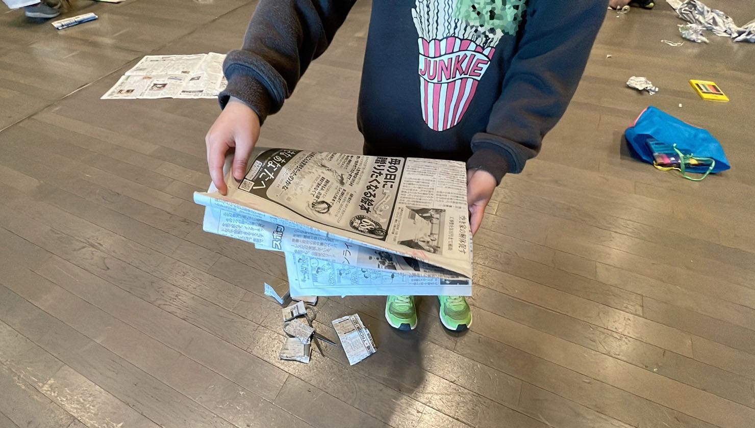 今日の工作タイムになりました。テーマはもちろん最初に登場した“新聞紙”です。